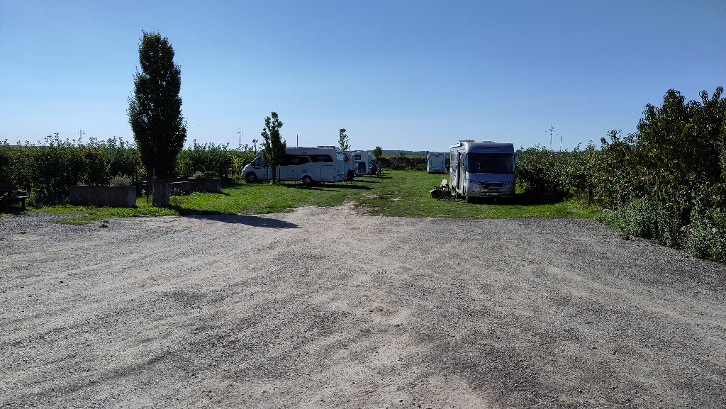 Die Gegend zwischen Würzburg und Schweinfurt hatten wir bisher nur auf der Durchreise registriert. Nun hat es aber einen Einlass in diese Gegend zu fahren und so beschlossen wir, nicht nur für den Termin dorthin zu fahren, sondern eine Woche in der Region zu bleiben und sie einmal gezielt zu erkunden. Also suchen wir uns einen Stellplatz in der Nähe aus Ausgangspunkt und fanden ihn im Weingut Schmitt, Am Weinfass 1 in Bergtheim. Das Weingut bietet eine größere Anzahl von Stellplätzen entweder in der kleinen Allee hinter der Einfahrt oder zwischen den Apfelbäumen. Die Stellplätze sind großzügig, mit oder ohne Strom und modernen Sanitäranlagen und Entsorgungsstation am Rande des Ortes. Der Stellplatz ist auch bei Campern mit Hunden beliebt, da hinter dem Gelände weitläufige Felder für Gassigänge sind. Durch einen Hinterausgang bei den Stellplätzen kommt man mit den Hunden direkt auf die Feldwege. Diese sind zum Teil mit Betonplatten gebaut und sonst gut geschottert. Wir hatten zwar Glück mit dem Wetter und die Wege waren trocken, aber so wie sie angelegt sind, sollten sie auch bei Regenwetter gut begehbar sein.