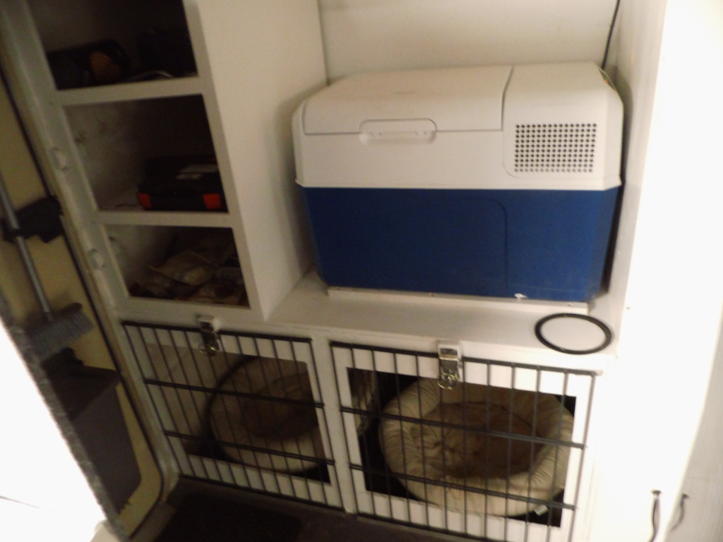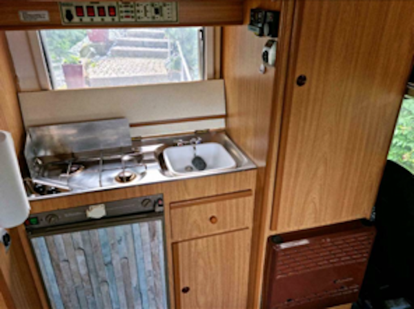 Da die alte Küche (siehe Bild), bestehend aus Koch- und Spüleinheit und Absorberkühlschrank, auch ihr Ende finden sollte, da nicht mehr wirklich sauber zu bekommen, entschieden wir diese gleich auszubauen, um so die neue Wasserinstallation ungehindert einbauen zu können. Schon im Wohnwagen waren wir auf eine Kompressorkühlbox umgestiegen, da die Kühlleistung besser ist und wir zudem festgestellt hatten, dass die selbst im Hochsommer mit sehr wenig Strom auskommt. In einem Test hatten wir die Box mit einem mobilen Solarakku mit 216 Ah ohne Nachladen eine Woche im Hochsommer auf Stellplätzen ohne wirksame Abschattung durchgehend mit normaler Nutzung betrieben. Am Ende war der Akku bei einer Restkapazität von 20% und mit dem dazugehörigen mobilen Solarpanel in sechs Stunden wieder auf 100%.