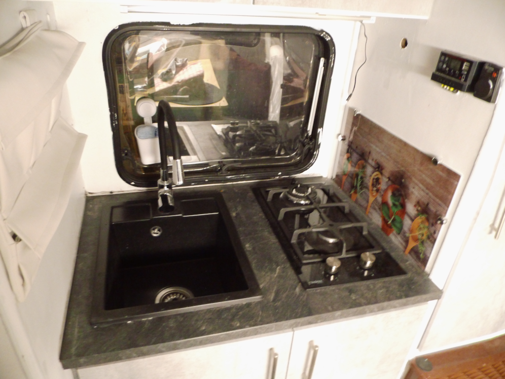 Nachdem nun die neuen Leitungen gezogen waren konnte der Wiederaufbau der Küche folgen. Da nun kein Kühlschrank mehr in der Küche war – die Kühlbox fand ihren Platz im Heck über den Hundeboxen, doch dazu später – musste der Rahmen neu aufgebaut werden und neue Türen mussten auch her. Da in der alten Anordnung die Spüle über dem Landstromanschluss und dem Sicherungskasten war, was mir eher nicht gefiel, beschlossen wir Kochfeld und Spüle zu tauschen, zumal auch der Gasverteiler auf der Seite montiert war und die Gasleitung ohnehin neu verlegt werden musste. Also gingen wir auf die Suche nach einer Spüle und einem 2-flammigen Gaskochfeld mit 50mbar. Für Katja war schnell klar, dass es eine anthrazitfarbene Granitspüle sein sollte. Von daher sollte das Gaskochfeld auch anthrazit oder schwarz sein. Ein passendes Stück Arbeitsplatte in 63,5 cm Tiefe hatten wir noch vom Umbau im Obergeschoss unseres Hauses. Nachdem beide Teile bestellt und letztlich auch geliefert waren konnte der Einbau beginnen.