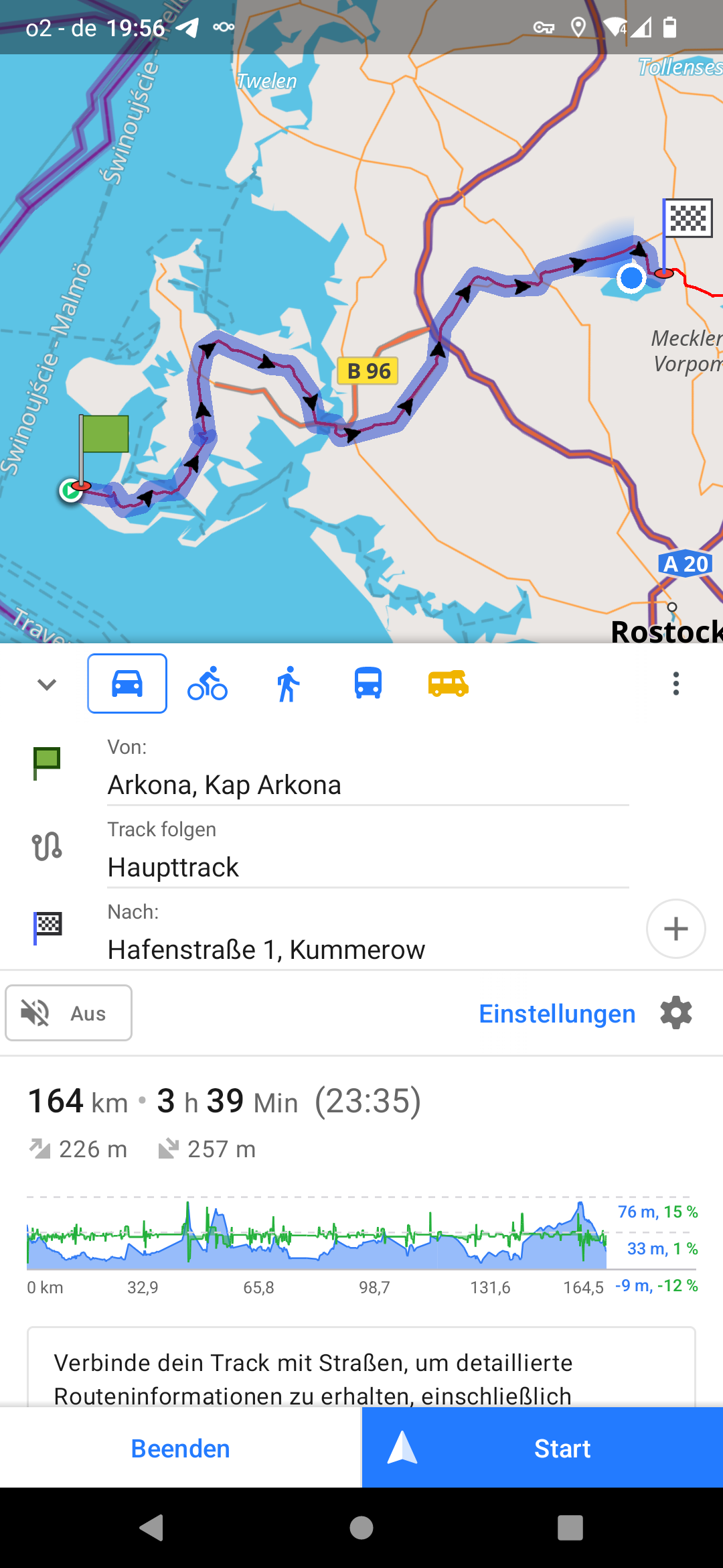 Erstens wäre es für die Nutzung hilfreich, wenn es zu jedem Abschnitt eine eigene Track-Datei gäbe. Zweitens sollten die Track-Dateien von allen unnötigen Wegpunkten bereinigt werden und nur die Wegpunkte enthalten, die für die Streckenführung relevant sind. Heute z.B. erschien ein Abbiegehinweis "scharf rechts abbiegen in 100m" nur gab es dort keine Möglichkeit scharf rechts abzubiegen. Bei genauer Betrachtung der Track-Datei war zu sehen, dass derjenige der den Track aufgezeichnet hat kurz halbrechts in eine kleine Seitenstraße eingebogen war und dann von dort scharf rechts auf die Hauptstraße zurück ist. Dies war als Wegpunkte im Track und führte zu dem unsinnigen Hinweis.