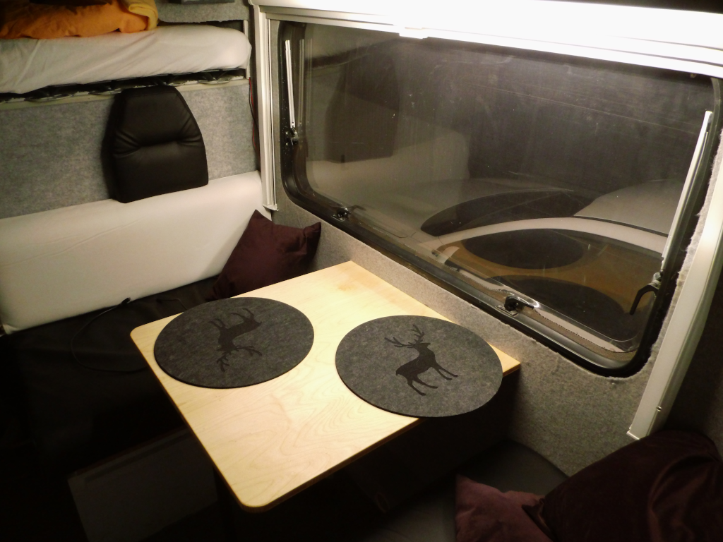 Nun hat unsere Reisende an den Außenwänden, der Decke und dem Alkoven im Wohnbereich ein hellgraues Wollfilzkleid von 3mm Stärke, was zudem noch eine zusätzliche Wärmedämmung mit sich bringt.